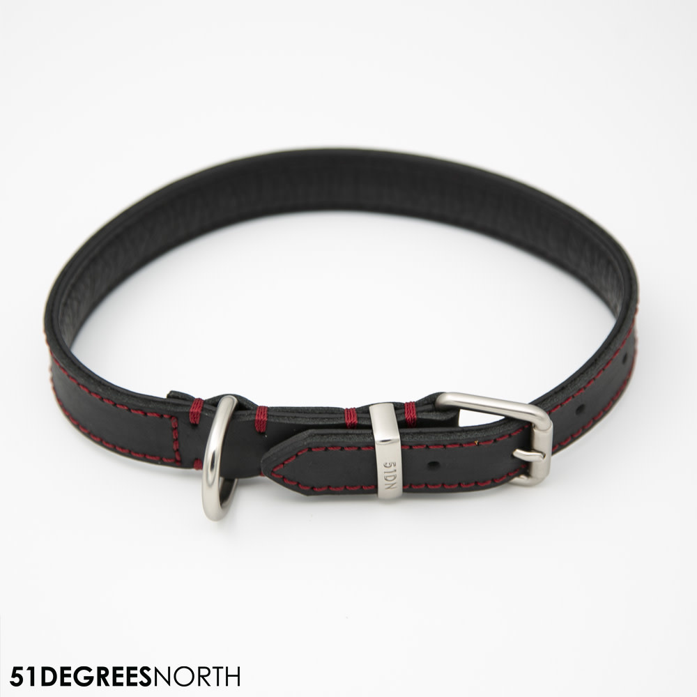 Een stijlvolle klassieke zwarte hondenhalsband van eersteklas dubbellaags leer. Het stiksel is in een contrasterende kleur uitgevoerd. In vele maten leverbaar.