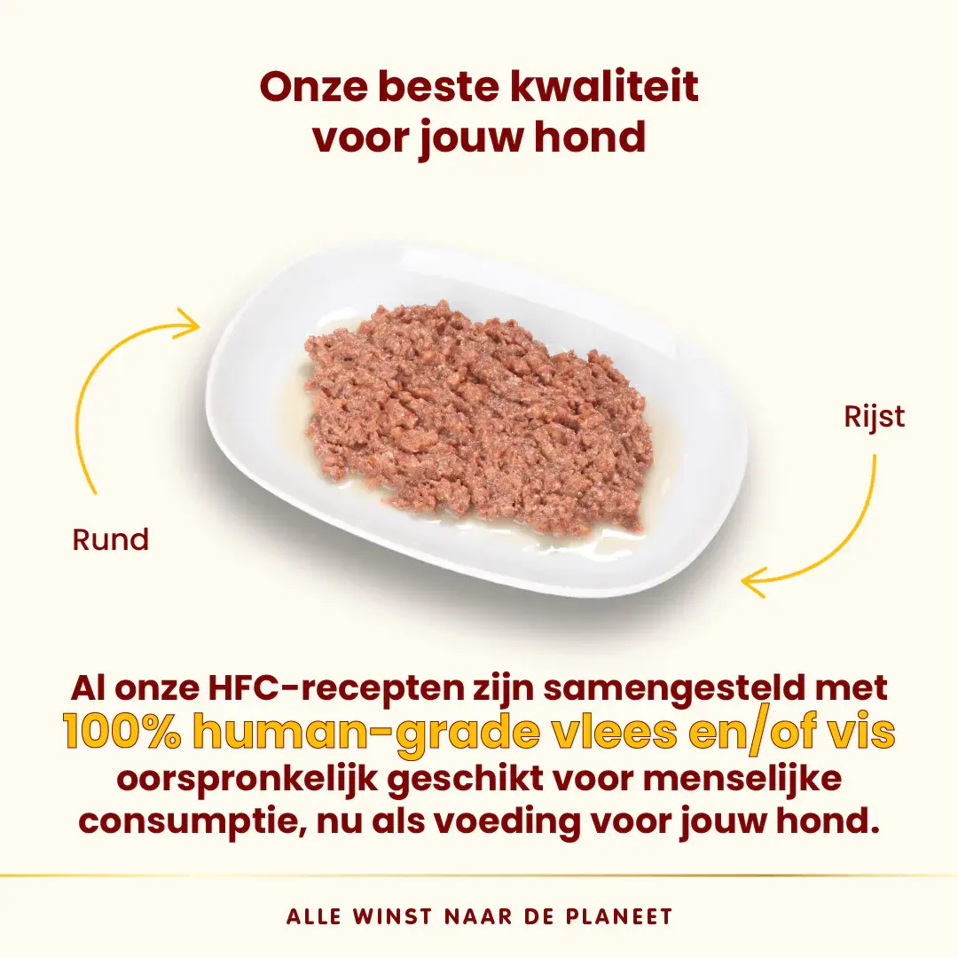 De Almo Nature HFC Natural-lijn is bereid met HFC-ingrediënten. Dat zijn ingrediënten die oorspronkelijk geschikt zijn voor menselijke consumptie en nu gebruikt worden in voeding voor honden.