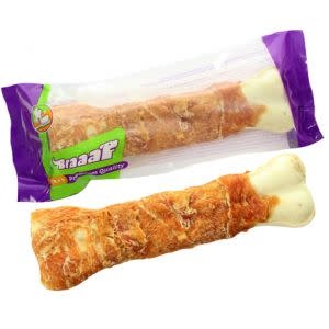 Geperst bot omhult met kippenvlees. Hierdoor word het bot voor een kieskeurige hond ook erg aantrekkelijk.
