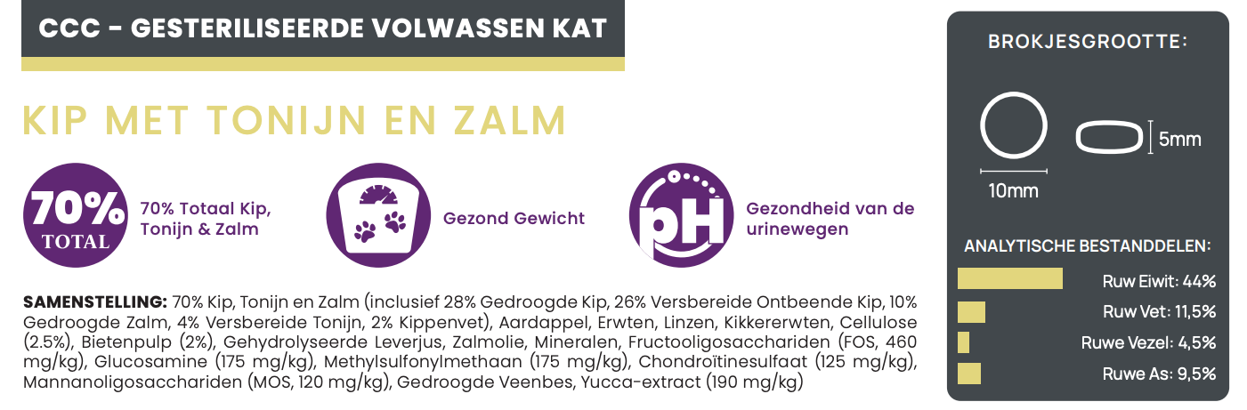 70% Kip, Tonijn en Zalm (inclusief 28% Gedroogde Kip, 26% Versbereide Ontbeende Kip, 10% Gedroogde Zalm, 4% Versbereide Tonijn, 2% Kippenvet), Aardappel, Erwten, Linzen, Kikkererwten, Cellulose (2.5%), Bietenpulp (2%), Gehydrolyseerde Leverjus, Zalmolie, Mineralen, Fructooligosacchariden (FOS, 460 mg/kg), Glucosamine (175 mg/kg), Methylsulfonylmethaan (175 mg/kg), Chondroïtinesulfaat (125 mg/kg), Mannanoligosacchariden (MOS, 120 mg/kg), Gedroogde Veenbes, Yucca-extract (190 mg/kg)