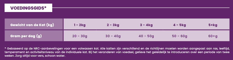 Ruw Eiwit 44% Ruw Vet 11,5% Ruwe Vezel 4,5% Ruwe As 9,5% Vocht 5% NFE 25,5% Omega 6 Vetzuren 2,4% Omega 3 Vetzuren 0,6% Calcium 1,9% Fosfor 1,5% Metaboliseerbare energie 370 kcal/100g