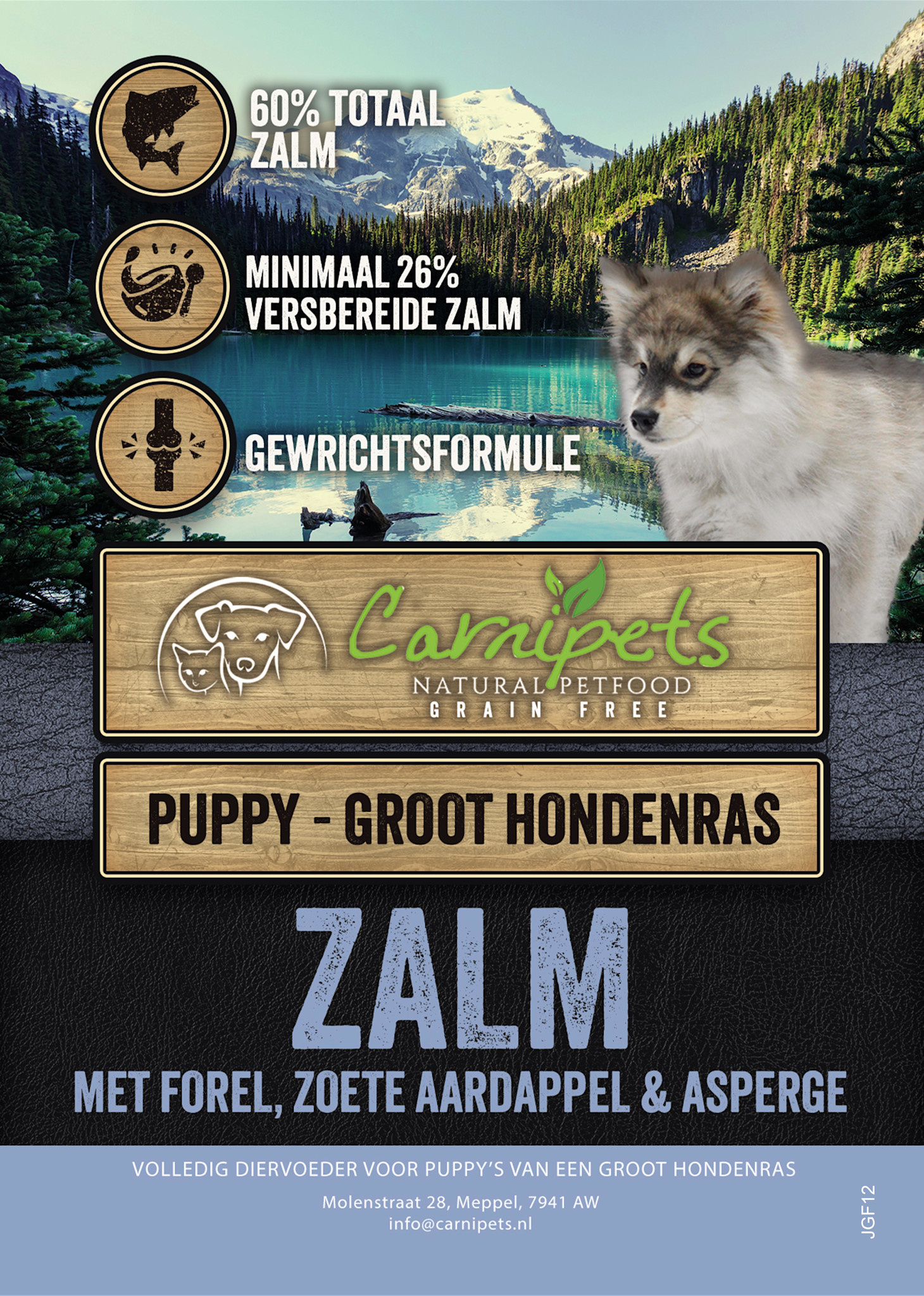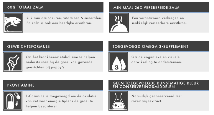 Zalm 60% (Versbereide Zalm 38%, Gedroogde Zalm 20%, Zalmbouillon), Zoete Aardappel (19%), Aardappel, Bietenpulp, Lijnzaad, Mineralen, Wor tel, Er wten (0,2%), Omega 3 Supplement, Glucosamine (355 mg / kg), Methylsulfonylmethaan (355 mg / kg), Chondroïtinesulfaat (250 mg / kg), Nucleotiden, Fructooligosacchariden (FOS, 96 mg / kg), Mannanoligosacchariden (MOS, 24 mg / kg)