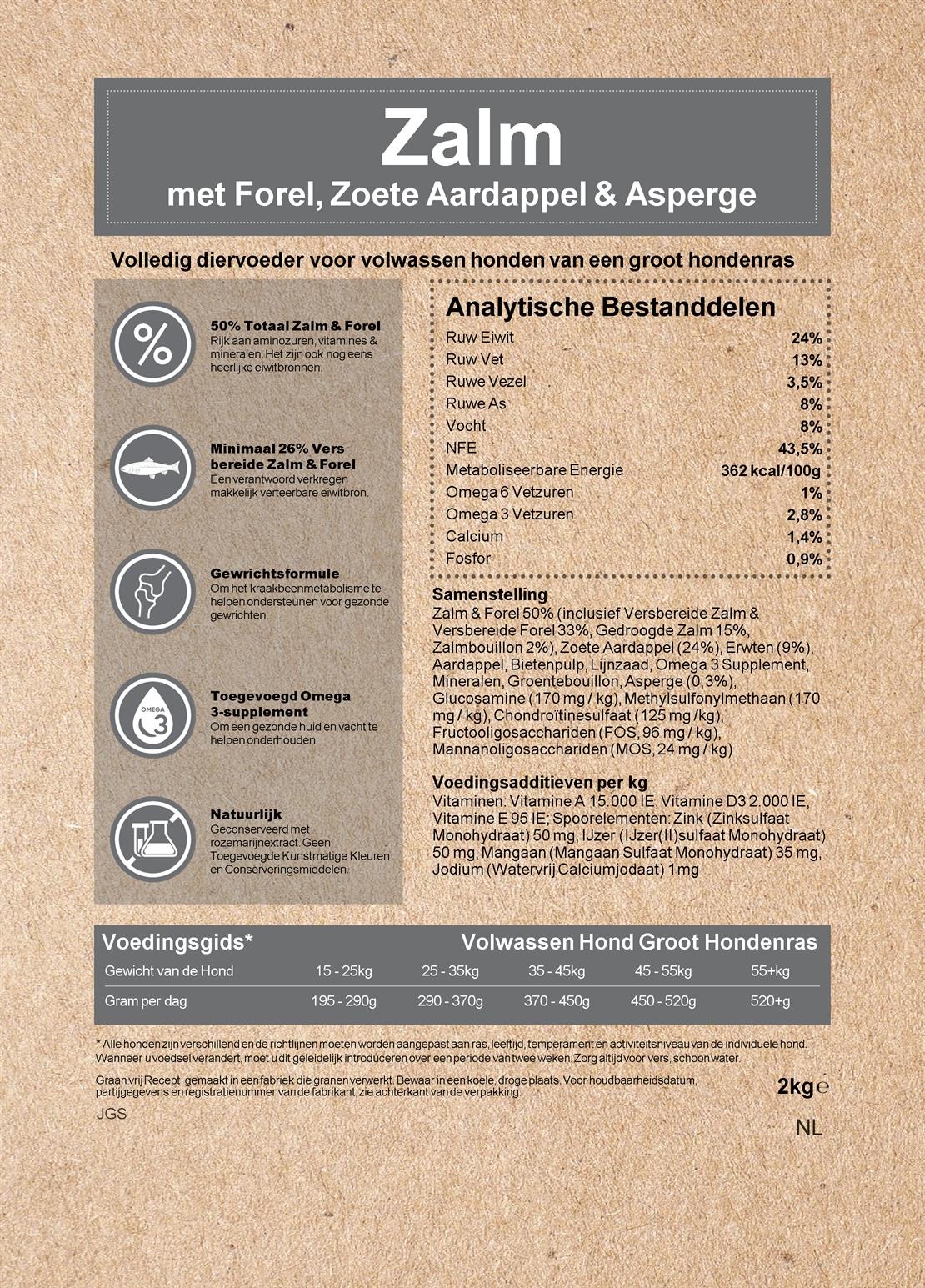 Zalm & Forel 50% (inclusief Versbereide Zalm & Forel 36%, Gedroogde Zalm 12% en Zalmbouillon 2%), Zoete Aardappel (24%), Erwten (9%),