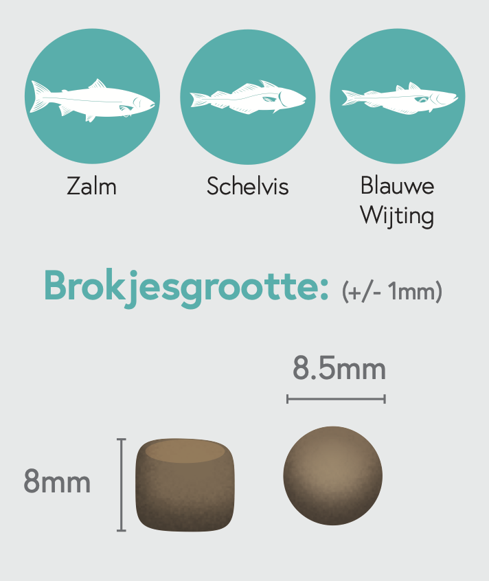 - Hoofdingrediënten: 60% Totaal Zalm, Schelvis en Blauwe Wijting
