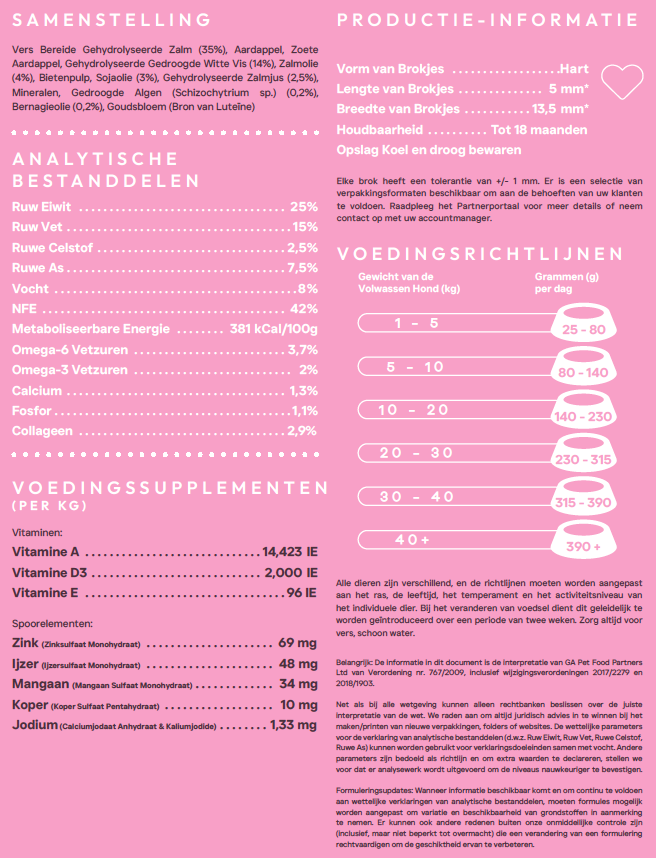 Vers bereide gehydrolyseerde zalm (35%), aardappel, zoete aardappel, gehydrolyseerde gedroogde witte vis (14%), zalmolie (4%), bietenpulp, sojaolie (3%), gehydrolyseerde zalmjus (2,5%), mineralen, gedroogde algen (Schizochytrium sp.) (0,2%), bernagieolie (0,2%), goudsbloem (bron van luteïne).