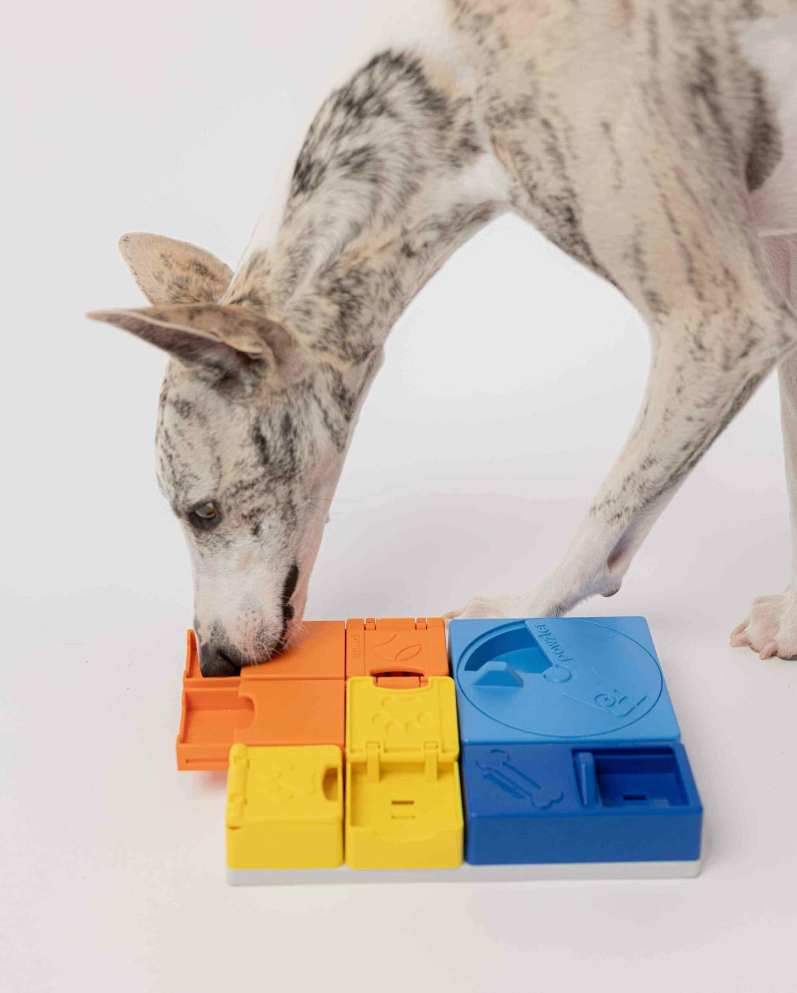 De Pawzler Rainbow Set is een kleurrijke, modulaire puzzel voor honden met diverse moeilijkheidsgraden. Ideaal voor honden die uitdaging nodig hebben en graag speuren naar beloningen.