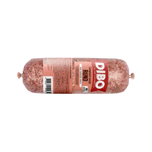 SAMENSTELLING: 71% Rundvlees (pens, spiervlees, long, nier, lever), 11 % Water, 7,5% Maïs, 4% Wortel, 3,5% Cichorei (gedroogd), Mineralen, Zonnebloemolie, Visolie ANALYTISCHE BESTANDDELEN: Vocht 67,6%, Ruw eiwit 11,6%, Ruw vet 8,7%, Ruwe celstof 0,8%, Ruwe as 3,0%, Calcium 0,46%, Fosfor 0,36%