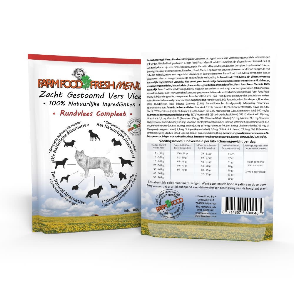 Farm Food Fresh Menu - Rundvlees compleet is een compleet en zachtgestoomd vers vlees ''menu'' voor alle honden van pup tot senior. Het product bevat geen kip of ander pluimvee, is glutenvrij en bevat geen gemalen bot. Farm Food Fresh Menu kan ongeopend b