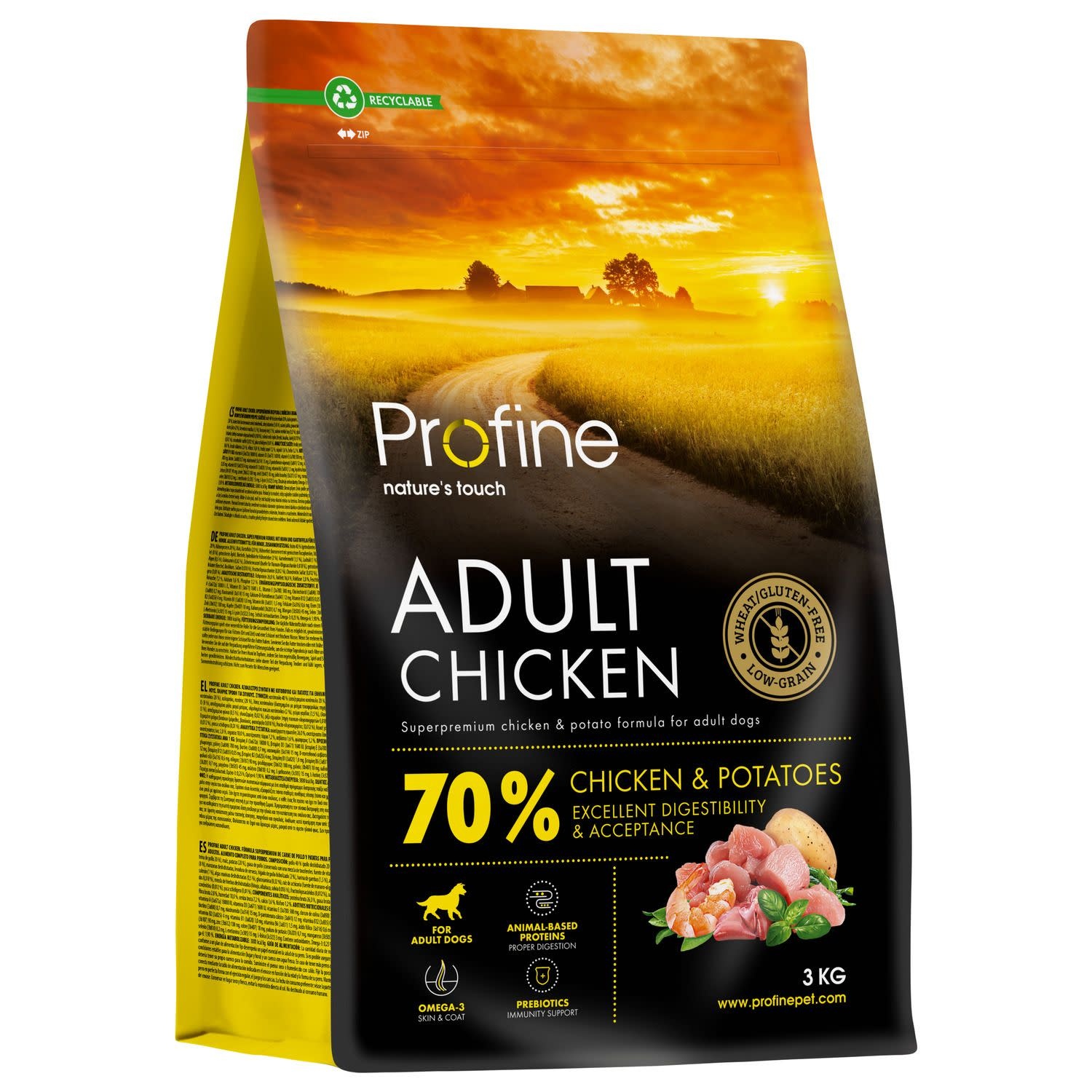 Natuurlijk hondenvoer op basis van kip en aardappelen. Profine Adult hondenvoer Chicken & Potatoes, met verbeterde receptuur sinds februari 2017, is geschikt voor volwassen honden van kleine en middelgrote rassen.