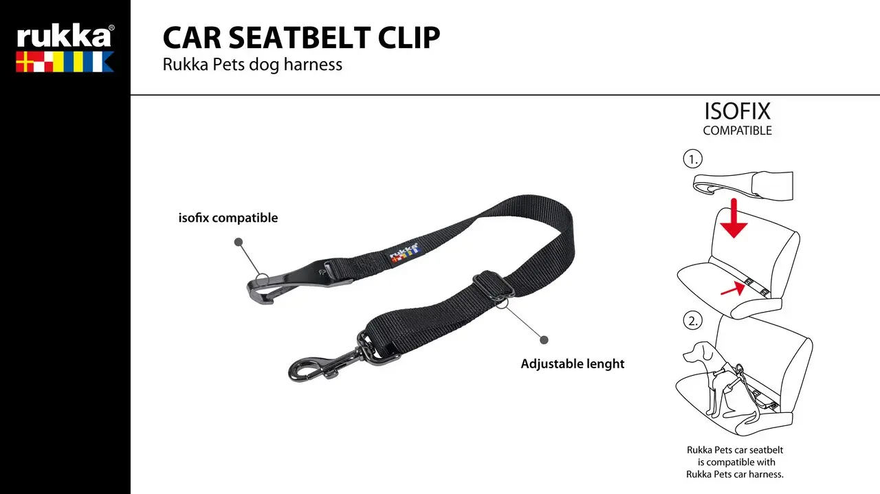 De Rukka Seatbelt Clip gemaakt van duurzaam nylon, is verstelbaar en eenvoudig te bevestigen aan de ISOFIX-sleuven van de auto die zich in de achterbank en de rugleuning of in de kofferbak van de meeste moderne auto's bevinden.